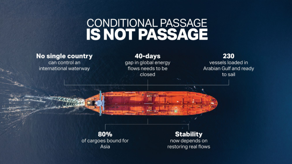 The ADNOC CEO emphasised the impact on energy markets of idle vessels either side of Hormuz. “A estimated 230 vessels sit loaded with oil… energy producers must be able to swiftly and safely restore production at scale.”