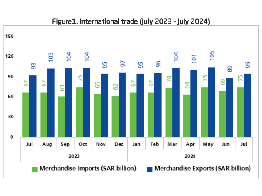 Saudi Arabia’s non-oil exports increased by 19% in July 2024 compared to the same month in 2023, reaching SAR 25.4 billion. National non-oil exports, excluding re-exports, grew by 6.5%, while the value of re-exported goods surged by 78.4%, according to the General Authority for Statistics​.