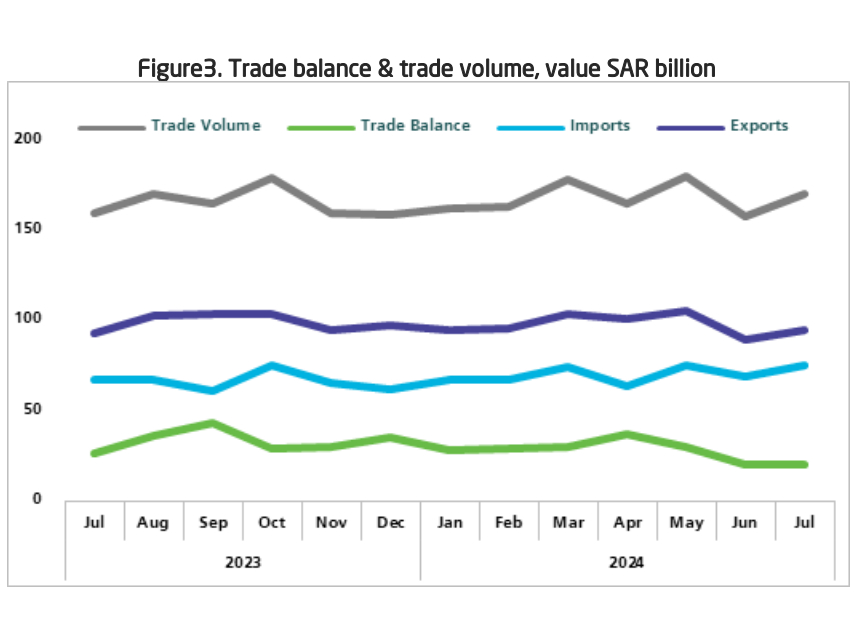 Despite a 3.1% decline in oil exports, overall merchandise exports saw a 2% year-on-year increase, with oil exports’ share of total exports falling from 77% in July 2023 to 73.1% in July 2024. Imports rose by 12.6%, while the trade surplus decreased by 25.4%.