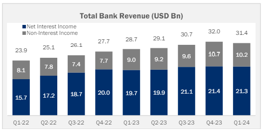 Overall, revenues for the sector reached $31.4 billion, down from a record high of $32 billion during the previous quarter but higher than the $28.7 billion recorded in Q1 2023. The researchers attributed the quarterly decrease to the decline in net interest and non-interest income.