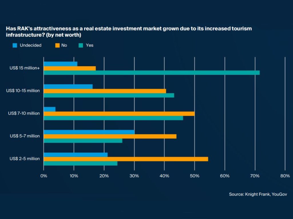 Knight Frank found that 46% of global HNWIs view RAK more favourably due to its economic transformation and increasing level of tourism infrastructure. This figure climbs to 75% of those with a net worth of over $20 million.