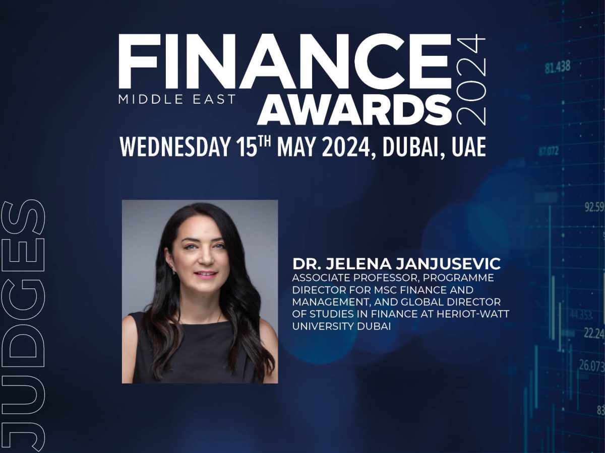Dr Jelena Janjusevic, Associate Professor, Programme Director for MSC Finance and Management, and Global Director of Studies in Finance at Heriot-Watt University Dubai, was revealed as a member of the illustrious jury panel judging the inaugural edition of the Finance Middle East Awards set to take place on May 15.
