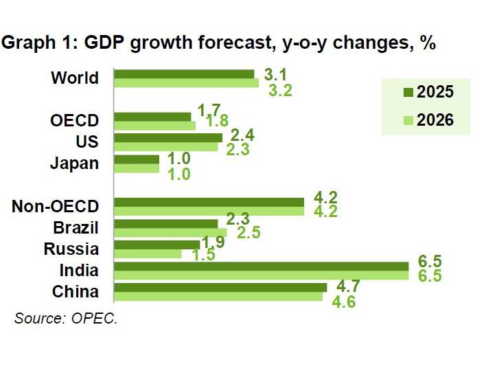 OPEC projects global economic growth to reach 3.1% in 2025, slightly increasing to 3.2% in 2026. Growth drivers include inflation normalisation and adjusted monetary policies in key economies. India and China remain pivotal, with expected growth rates of 6.5% and 4.7% in 2025, respectively. Advanced economies such as the US and Eurozone are forecast to grow modestly, while Brazil and Russia show improved projections due to recovering industrial and export sectors.