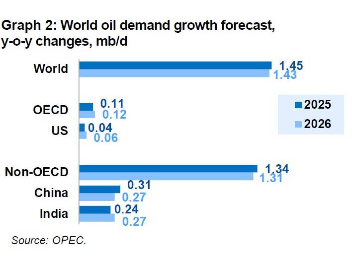 Global oil demand is set to grow by 1.4 million barrels per day (mb/d) annually through 2026. Non-OECD countries, led by India, China, and the Middle East, will contribute approximately 1.3 mb/d annually, with OECD regions accounting for an additional 0.1 mb/d.