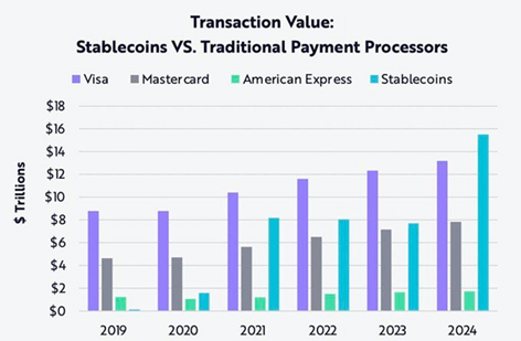 In 2024, stablecoins achieved a historic milestone, processing over $14 trillion in transactions, outpacing the traditional payment networks such as Visa ($12.3 trillion) and Mastercard ($9.1 trillion) for the first time.